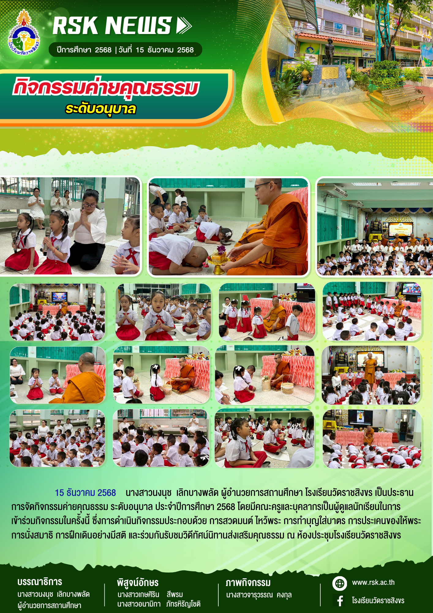 15 ธันวาคม 2568 นางสาวนงนุช เลิกบางพลัด ผู้อำนวยการสถานศึกษา โรงเรียนวัดราชสิงขร เป็นประธานการจัดกิจกรรมค่ายคุณธรรม ระดับอนุบาล ประจำปีการศึกษา 2568 โดยมีคณะครูและบุคลากรเป็นผู้ดูแลนักเรียนในการเข้าร่วมกิจกรรมในครั้งนี้ ซึ่งการดำเนินกิจกรรมประกอบด้วย การสวดมนต์ ไหว้พระ การทำบุญใส่บาตร การประเคนของให้พระ การนั่งสมาธิ การฝึกเดินอย่างมีสติ และร่วมกันรับชมวิดีทัศน์นิทานส่งเสริมคุณธรรม ณ ห้องประชุมโรงเรียนวัดราชสิงขร