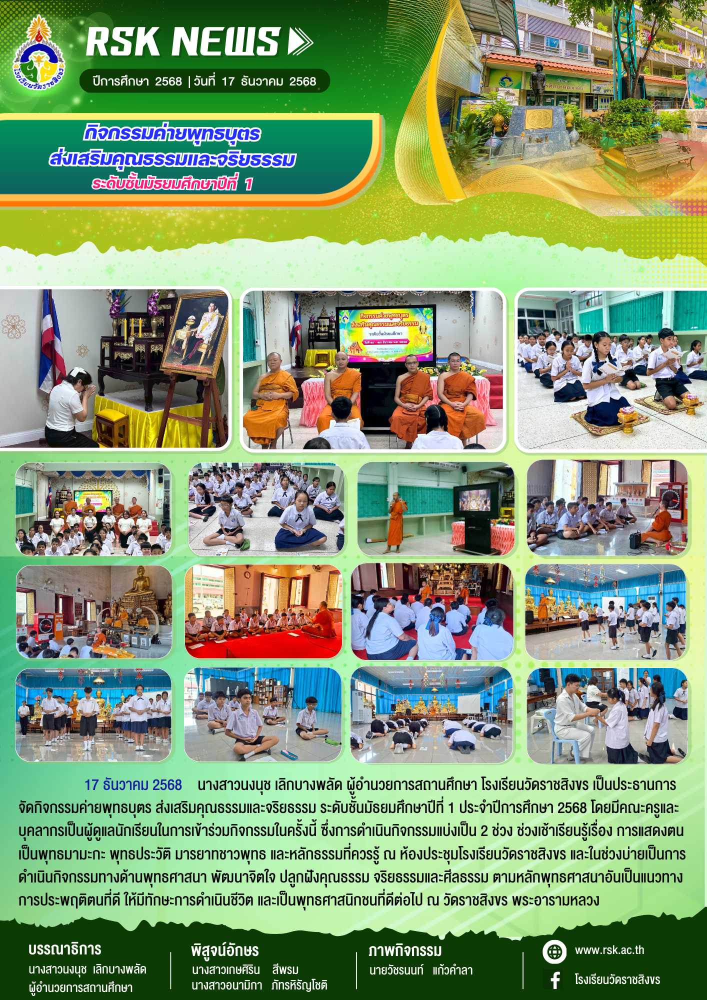 17 ธันวาคม 2568 นางสาวนงนุช เลิกบางพลัด ผู้อำนวยการสถานศึกษา โรงเรียนวัดราชสิงขร เป็นประธานการจัดกิจกรรมค่ายพุทธบุตร ส่งเสริมคุณธรรมและจริยธรรม ระดับชั้นมัธยมศึกษาปีที่ 1 ประจำปีการศึกษา 2568 โดยมีคณะครูและบุคลากรเป็นผู้ดูแลนักเรียนในการเข้าร่วมกิจกรรมในครั้งนี้ ซึ่งการดำเนินกิจกรรมแบ่งเป็น 2 ช่วง ช่วงเช้าเรียนรู้เรื่อง การแสดงตนเป็นพุทธมามะกะ พุทธประวัติ มารยาทชาวพุทธ และหลักธรรมที่ควรรู้ ณ ห้องประชุมโรงเรียนวัดราชสิงขร และในช่วงบ่ายเป็นการดำเนินกิจกรรมทางด้านพุทธศาสนา พัฒนาจิตใจ ปลูกฝังคุณธรรม จริยธรรมและศีลธรรม ตามหลักพุทธศาสนาอันเป็นแนวทางการประพฤติตนที่ดี ให้มีทักษะการดำเนินชีวิต และเป็นพุทธศาสนิกชนที่ดีต่อไป ณ วัดราชสิงขร พระอารามหลวง