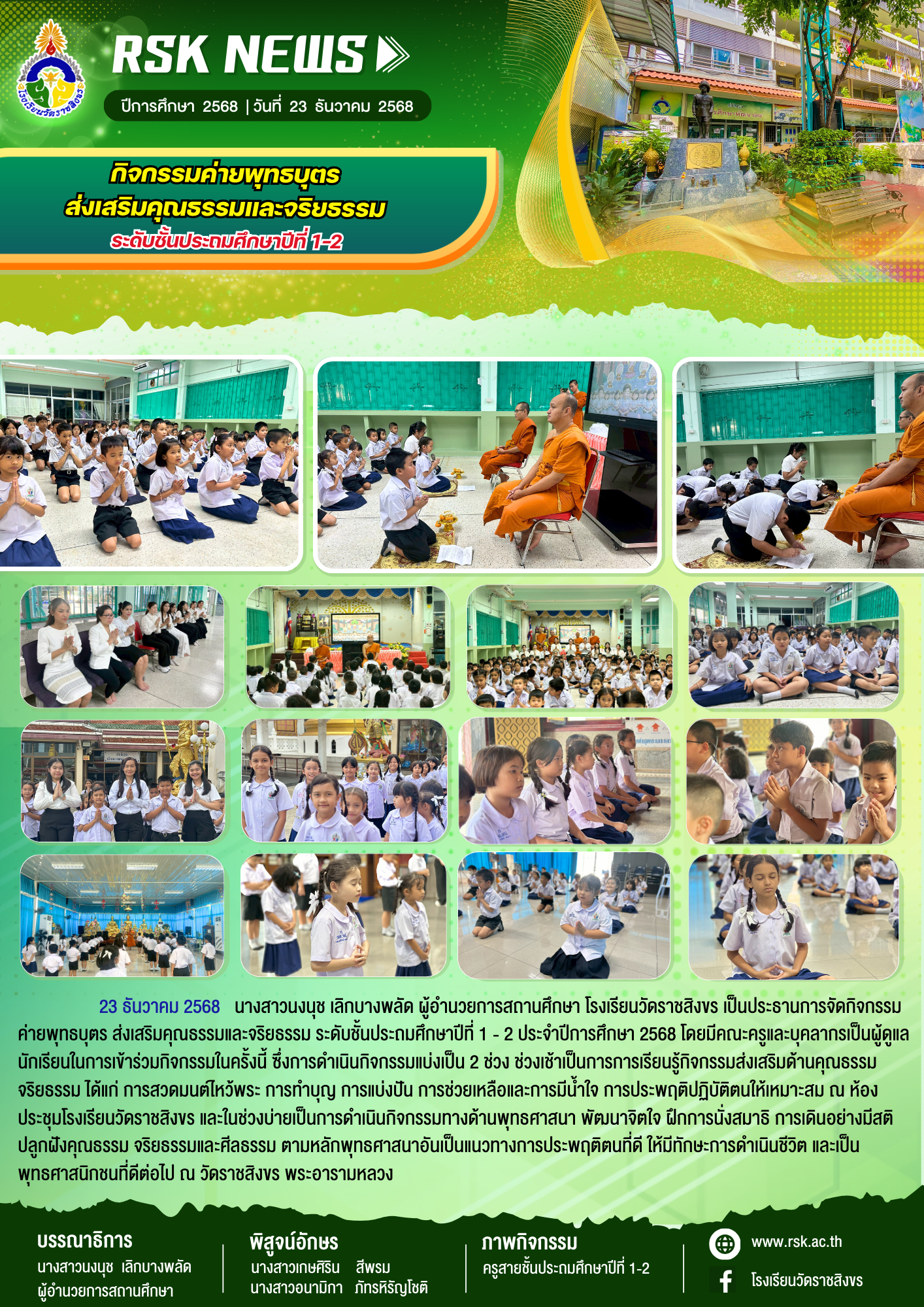 23 ธันวาคม 2568 นางสาวนงนุช เลิกบางพลัด ผู้อำนวยการสถานศึกษา โรงเรียนวัดราชสิงขร เป็นประธานการจัดกิจกรรมค่ายพุทธบุตร ส่งเสริมคุณธรรมและจริยธรรม ระดับชั้นประถมศึกษาปีที่ 1 – 2 ประจำปีการศึกษา 2568 โดยมีคณะครูและบุคลากรเป็นผู้ดูแลนักเรียนในการเข้าร่วมกิจกรรมในครั้งนี้ ซึ่งการดำเนินกิจกรรมแบ่งเป็น 2 ช่วง ช่วงเช้าเป็นการการเรียนรู้กิจกรรมส่งเสริมด้านคุณธรรมจริยธรรม ได้แก่ การสวดมนต์ไหว้พระ การทำบุญ การแบ่งปัน การช่วยเหลือและการมีน้ำใจ การประพฤติปฏิบัติตนให้เหมาะสม ณ ห้องประชุมโรงเรียนวัดราชสิงขร และในช่วงบ่ายเป็นการดำเนินกิจกรรมทางด้านพุทธศาสนา พัฒนาจิตใจ ฝึกการนั่งสมาธิ การเดินอย่างมีสติปลูกฝังคุณธรรม จริยธรรมและศีลธรรม ตามหลักพุทธศาสนาอันเป็นแนวทางการประพฤติตนที่ดี ให้มีทักษะการดำเนินชีวิต และเป็นพุทธศาสนิกชนที่ดีต่อไป ณ วัดราชสิงขร พระอารามหลวง