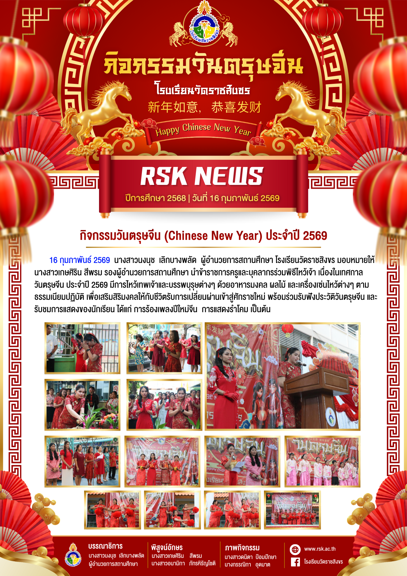 16 กุมภาพันธ์ 2569 นางสาวนงนุช เลิกบางพลัด ผู้อำนวยการสถานศึกษา โรงเรียนวัดราชสิงขร มอบหมายให้นางสาวเกษศิริน สีพรม รองผู้อำนวยการสถานศึกษา นำข้าราชการครูและบุคลากรร่วมพิธีไหว้เจ้า เนื่องในเทศกาลวันตรุษจีน ประจำปี 2569 มีการไหว้เทพเจ้าและบรรพบุรุษต่างๆ ด้วยอาหารมงคล ผลไม้ และเครื่องเซ่นไหว้ต่างๆ ตามธรรมเนียมปฏิบัติ เพื่อเสริมสิริมงคลให้กับชีวิตรับการเปลี่ยนผ่านเข้าสู่ศักราชใหม่ พร้อมร่วมรับฟังประวัติวันตรุษจีน และรับชมการแสดงของนักเรียน ได้แก่ การร้องเพลงปีใหม่จีน การแสดงรำโคม เป็นต้น