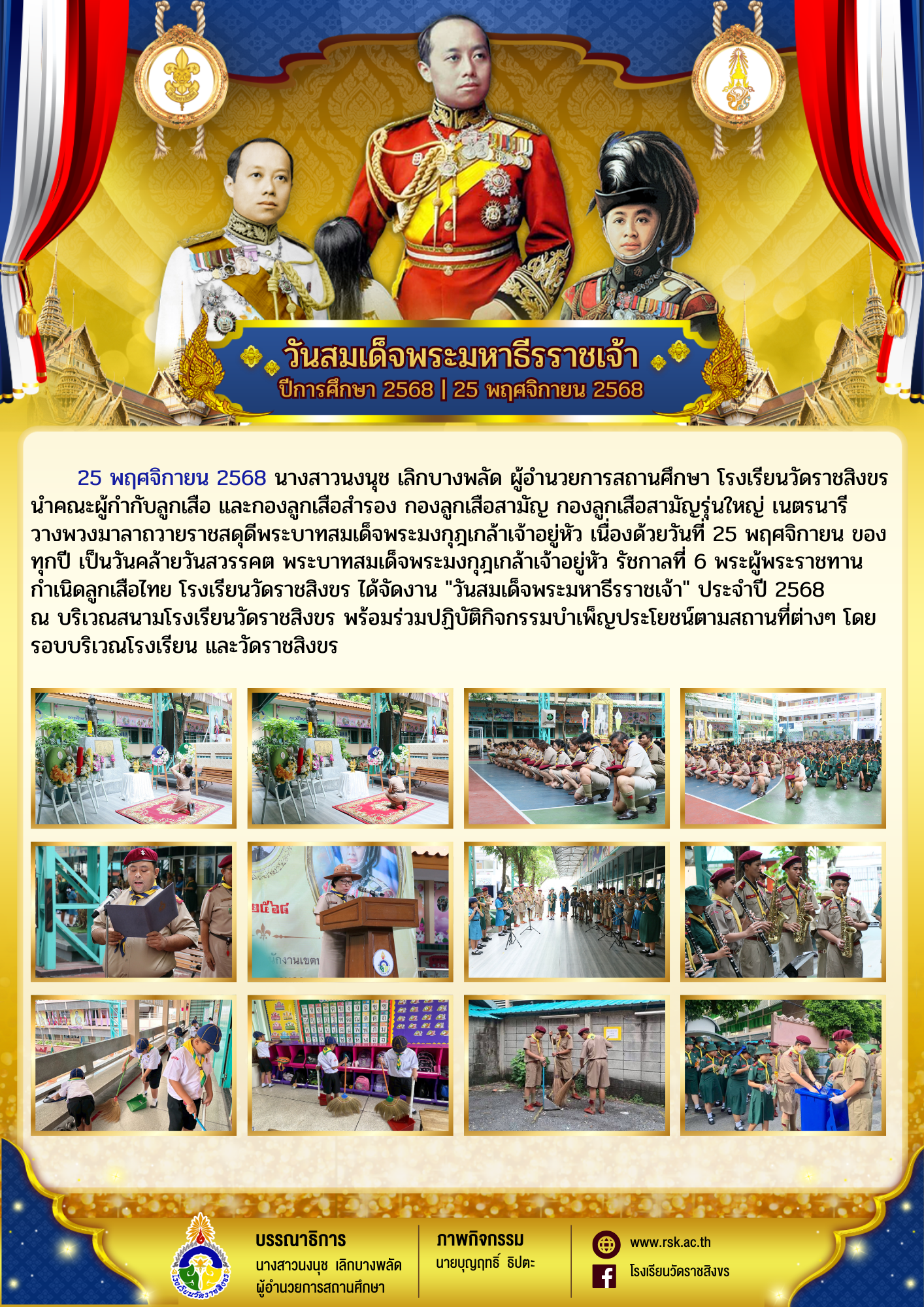 25 พฤศจิกายน 2568 นางสาวนงนุช เลิกบางพลัด ผู้อำนวยการสถานศึกษา โรงเรียนวัดราชสิงขร นำคณะผู้กำกับลูกเสือ และกองลูกเสือสำรอง กองลูกเสือสามัญ กองลูกเสือสามัญรุ่นใหญ่ เนตรนารี วางพวงมาลาถวายราชสดุดีพระบาทสมเด็จพระมงกุฎเกล้าเจ้าอยู่หัว เนื่องด้วยวันที่ 25 พฤศจิกายน ของทุกปี เป็นวันคล้ายวันสวรรคต พระบาทสมเด็จพระมงกุฎเกล้าเจ้าอยู่หัว รัชกาลที่ 6 พระผู้พระราชทานกำเนิดลูกเสือไทย โรงเรียนวัดราชสิงขร ได้จัดงาน