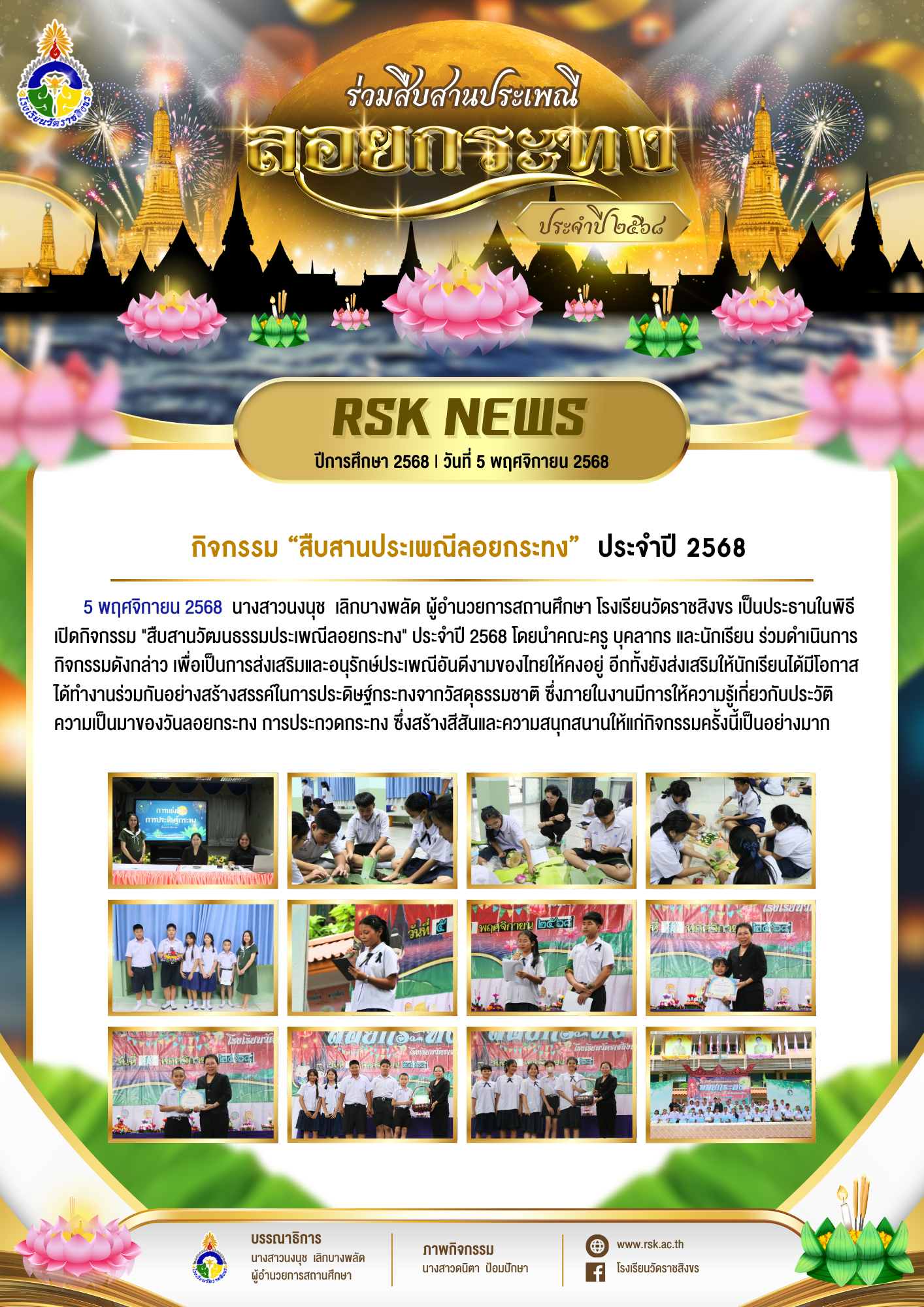 5 พฤศจิกายน 2568 นางสาวนงนุช เลิกบางพลัด ผู้อำนวยการสถานศึกษา โรงเรียนวัดราชสิงขร เป็นประธานในพิธีเปิดกิจกรรม “สืบสานวัฒนธรรมประเพณีลอยกระทง” ประจำปี 2568 โดยนำคณะครู บุคลากร และนักเรียน ร่วมดำเนินการกิจกรรมดังกล่าว เพื่อเป็นการส่งเสริมและอนุรักษ์ประเพณีอันดีงามของไทยให้คงอยู่ อีกทั้งยังส่งเสริมให้นักเรียนได้มีโอกาสได้ทำงานร่วมกันอย่างสร้างสรรค์ในการประดิษฐ์กระทงจากวัสดุธรรมชาติ ซึ่งภายในงานมีการให้ความรู้เกี่ยวกับประวัติความเป็นมาของวันลอยกระทง การประกวดกระทง ซึ่งสร้างสีสันและความสนุกสนานให้แก่กิจกรรมครั้งนี้เป็นอย่างมาก