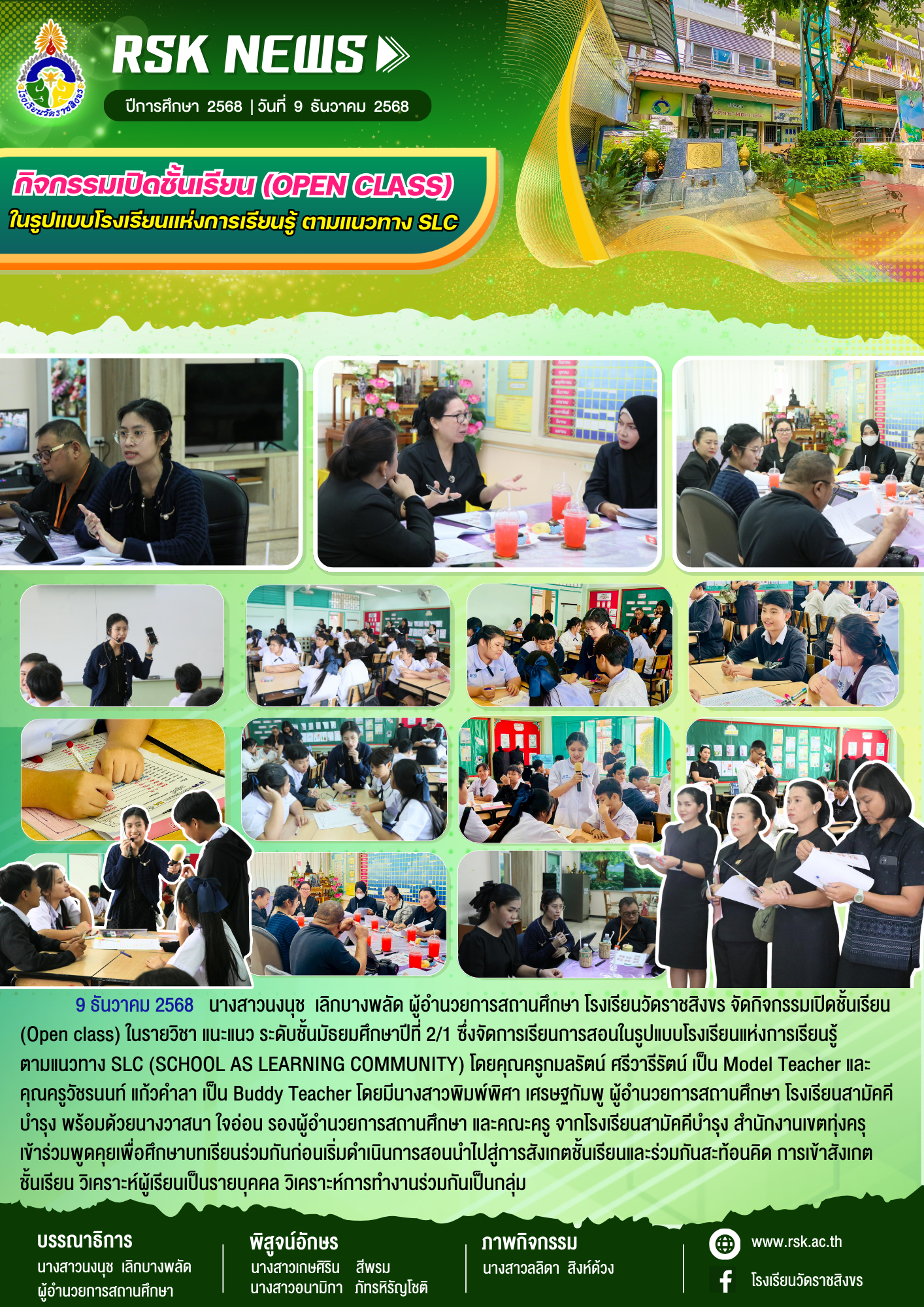 9 ธันวาคม 2568 นางสาวนงนุช เลิกบางพลัด ผู้อำนวยการสถานศึกษา โรงเรียนวัดราชสิงขร จัดกิจกรรมเปิดชั้นเรียน (Open class) ในรายวิชา แนะแนว ระดับชั้นมัธยมศึกษาปีที่ 2/1 ซึ่งจัดการเรียนการสอนในรูปแบบโรงเรียนแห่งการเรียนรู้ ตามแนวทาง SLC (SCHOOL AS LEARNING COMMUNITY) โดยคุณครูกมลรัตน์ ศรีวารีรัตน์ เป็น Model Teacher และคุณครูวัชรนนท์ แก้วคำลา เป็น Buddy Teacher โดยมีนางสาวพิมพ์พิศา เศรษฐกัมพู ผู้อำนวยการสถานศึกษา โรงเรียนสามัคคีบำรุง พร้อมด้วยนางวาสนา ใจอ่อน รองผู้อำนวยการสถานศึกษา และคณะครู จากโรงเรียนสามัคคีบำรุง สำนักงานเขตทุ่งครุ เข้าร่วมพูดคุยเพื่อศึกษาบทเรียนร่วมกันก่อนเริ่มดำเนินการสอนนำไปสู่การสังเกตชั้นเรียนและร่วมกันสะท้อนคิด การเข้าสังเกตชั้นเรียน วิเคราะห์ผู้เรียนเป็นรายบุคคล วิเคราะห์การทำงานร่วมกันเป็นกลุ่ม