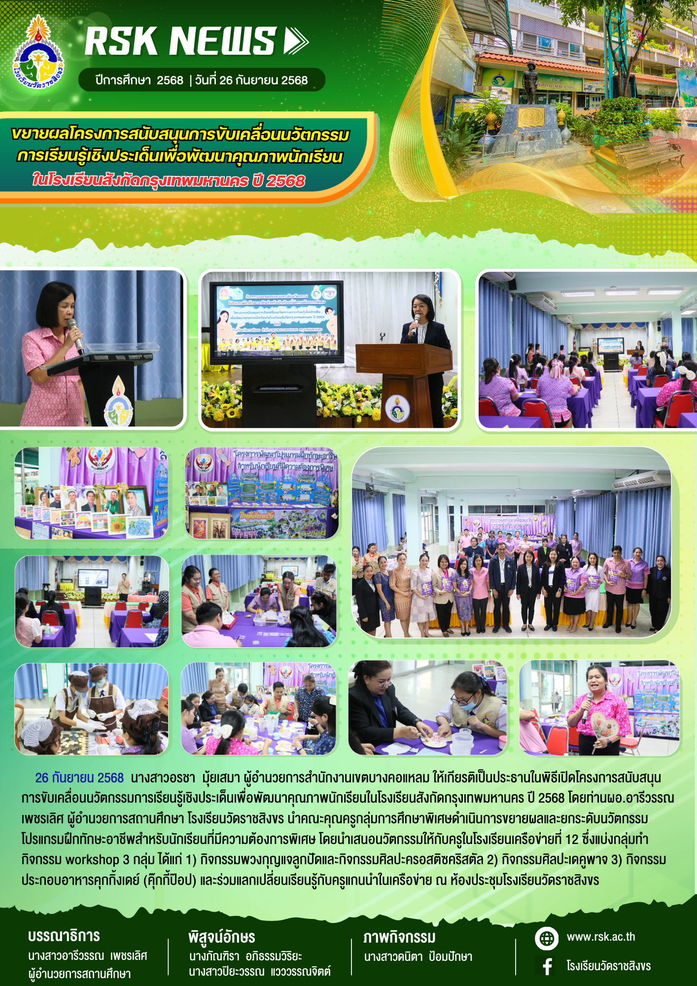 26 กันยายน 2568 นางสาวอรชา มุ้ยเสมา ผู้อำนวยการสำนักงานเขตบางคอแหลม ให้เกียรติเป็นประธานในพิธีเปิดโครงการสนับสนุนการขับเคลื่อนนวัตกรรมการเรียนรู้เชิงประเด็นเพื่อพัฒนาคุณภาพนักเรียนในโรงเรียนสังกัดกรุงเทพมหานคร ปี 2568 โดยท่านผอ.อารีวรรณ เพชรเลิศ ผู้อำนวยการสถานศึกษา โรงเรียนวัดราชสิงขร นำคณะคุณครูกลุ่มการศึกษาพิเศษดำเนินการขยายผลและยกระดับนวัตกรรมโปรแกรมฝึกทักษะอาชีพสำหรับนักเรียนที่มีความต้องการพิเศษ โดยนำเสนอนวัตกรรมให้กับครูในโรงเรียนเครือข่ายที่ 12 ซึ่งแบ่งกลุ่มทำกิจกรรม workshop 3 กลุ่ม ได้แก่ 1) กิจกรรมพวงกุญแจลูกปัดและกิจกรรมศิลปะครอสติซคริสตัล 2) กิจกรรมศิลปะเดคูพาจ 3) กิจกรรมประกอบอาหารคุกกิ้งเดย์ (คุ๊กกี้ป๊อป) และร่วมแลกเปลี่ยนเรียนรู้กับครูแกนนำในเครือข่าย ณ ห้องประชุมโรงเรียนวัดราชสิงขร