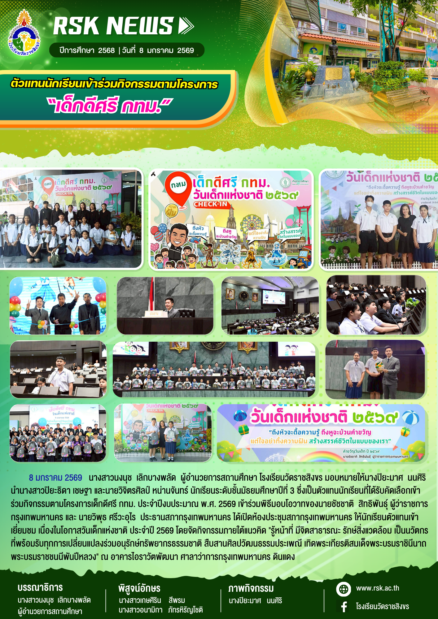 8 มกราคม 2569 นางสาวนงนุช เลิกบางพลัด ผู้อำนวยการสถานศึกษา โรงเรียนวัดราชสิงขร มอบหมายให้นางปิยะมาศ นนศิริ นำนางสาวปิยะธิดา เชษฐา และนายวิจิตรศิลป์ หน่านจันทร์ นักเรียนระดับชั้นมัธยมศึกษาปีที่ 3 ซึ่งเป็นตัวแทนนักเรียนที่ได้รับคัดเลือกเข้าร่วมกิจกรรมตามโครงการเด็กดีศรี กทม. ประจำปีงบประมาณ พ.ศ. 2569 เข้าร่วมพิธีมอบโอวาทของนายชัชชาติ สิทธิพันธ์ุ ผู้ว่าราชการกรุงเทพมหานคร และ นายวิพุธ ศรีวะอุไร ประธานสภากรุงเทพมหานคร ได้เปิดห้องประชุมสภากรุงเทพมหานคร ให้นักเรียนตัวแทนเข้าเยี่ยมชม เนื่องในโอกาสวันเด็กแห่งชาติ ประจำปี 2569 โดยจัดกิจกรรมภายใต้แนวคิด “รู้หน้าที่ มีจิตสาธารณะ รักษ์สิ่งแวดล้อม เป็นนวัตกรที่พร้อมรับทุกการเปลี่ยนแปลงร่วมอนุรักษ์ทรัพยากรธรรมชาติ สืบสานศิลปวัฒนธรรมประเพณี เทิดพระเกียรติสมเด็จพระบรมราชินีนาถ พระบรมราชชนนีพันปีหลวง” ณ อาคารไอราวัตพัฒนา ศาลาว่าการกรุงเทพมหานคร ดินแดง