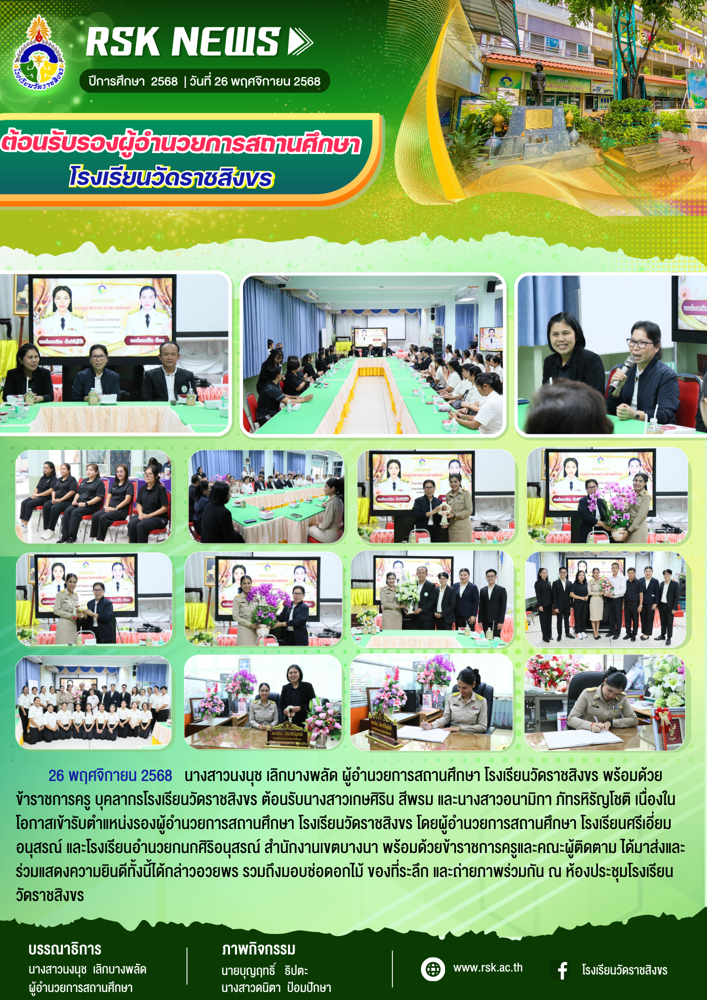 26 พฤศจิกายน 2568 นางสาวนงนุช เลิกบางพลัด ผู้อำนวยการสถานศึกษา โรงเรียนวัดราชสิงขร พร้อมด้วยข้าราชการครู บุคลากรโรงเรียนวัดราชสิงขร ต้อนรับนางสาวเกษศิริน สีพรม และนางสาวอนามิกา ภัทรหิรัญโชติ เนื่องในโอกาสเข้ารับตำแหน่งรองผู้อำนวยการสถานศึกษา โรงเรียนวัดราชสิงขร โดยผู้อำนวยการสถานศึกษา โรงเรียนศรีเอี่ยมอนุสรณ์ และโรงเรียนอำนวยกนกศิริอนุสรณ์ สำนักงานเขตบางนา พร้อมด้วยข้าราชการครูและคณะผู้ติดตาม ได้มาส่งและร่วมแสดงความยินดีทั้งนี้ได้กล่าวอวยพร รวมถึงมอบช่อดอกไม้ ของที่ระลึก และถ่ายภาพร่วมกัน ณ ห้องประชุมโรงเรียนวัดราชสิงขร