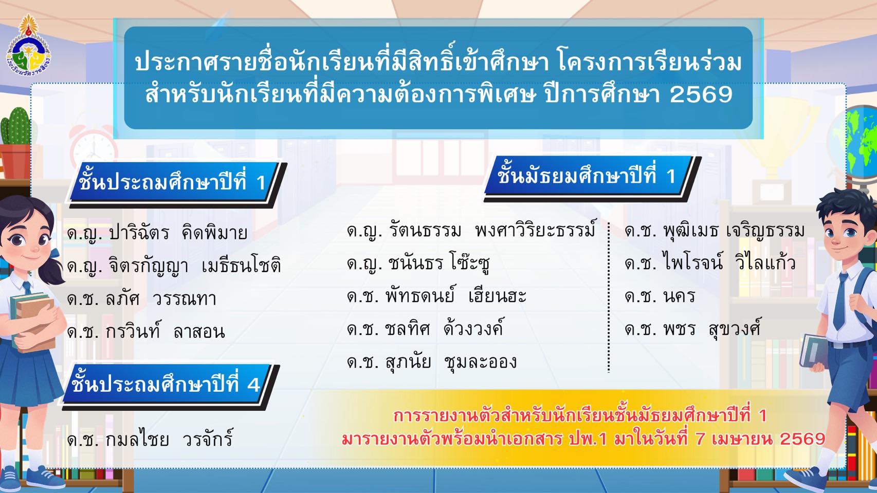 ประกาศกลุ่มงานการศึกษาพิเศษโรงเรียนวัดราชสิงขร เรื่อง ประกาศรายชื่อนักเรียนที่มีสิทธิ์เข้าศึกษาโครงการเรียนร่วม สำหรับนักเรียนที่มีความต้องการพิเศษ ปีการศึกษา 2569