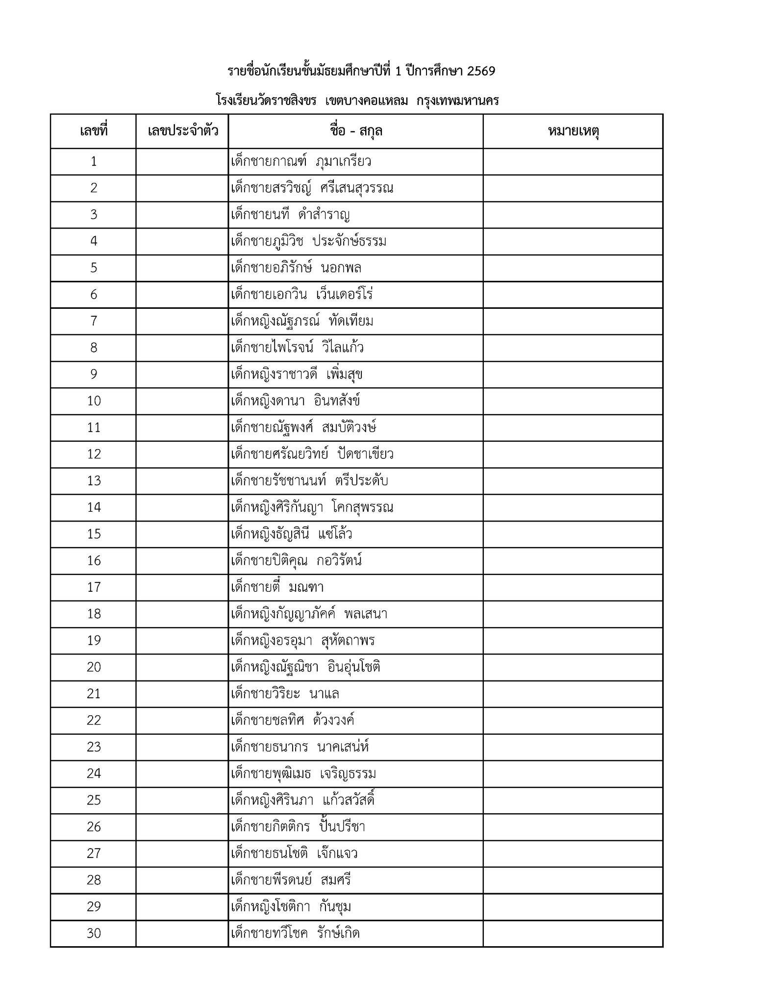 ประกาศรายชื่อนักเรียนที่มีสิทธิ์เข้าศึกษาต่อในระดับชั้นมัธยมศึกษาปีที่ 1 โรงเรียนวัดราชสิงขร