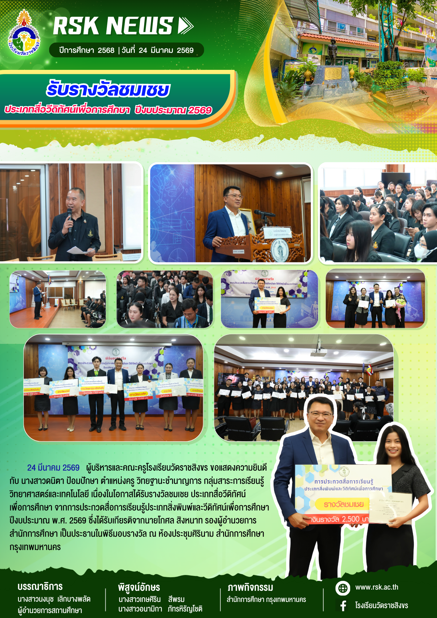 24 มีนาคม 2569 ผู้บริหารและคณะครูโรงเรียนวัดราชสิงขร ขอแสดงความยินดีกับ นางสาวดนิตา ป้อมปักษา ตำแหน่งครู วิทยฐานะชำนาญการ กลุ่มสาระการเรียนรู้วิทยาศาสตร์และเทคโนโลยี เนื่องในโอกาสได้รับรางวัลชมเชย ประเภทสื่อวีดิทัศน์เพื่อการศึกษา จากการประกวดสื่อการเรียนรู้ประเภทสิ่งพิมพ์และวีดิทัศน์เพื่อการศึกษา ปีงบประมาณ พ.ศ. 2569 ซึ่งได้รับเกียรติจากนายโกศล สิงหนาท รองผู้อำนวยการสำนักการศึกษา เป็นประธานในพิธีมอบรางวัล ณ ห้องประชุมศิรินาม สำนักการศึกษา กรุงเทพมหานคร