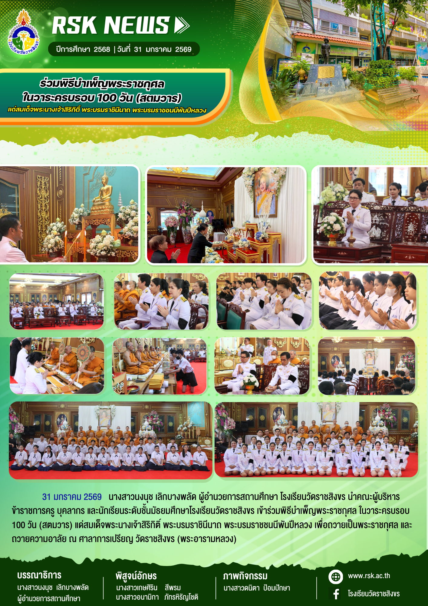 31 มกราคม 2569 นางสาวนงนุช เลิกบางพลัด ผู้อำนวยการสถานศึกษา โรงเรียนวัดราชสิงขร นำคณะผู้บริหารข้าราชการครู บุคลากร และนักเรียนระดับชั้นมัธยมศึกษาโรงเรียนวัดราชสิงขร เข้าร่วมพิธีบำเพ็ญพระราชกุศล ในวาระครบรอบ 100 วัน (สตมวาร) แด่สมเด็จพระนางเจ้าสิริกิติ์ พระบรมราชินีนาถ พระบรมราชชนนีพันปีหลวง เพื่อถวายเป็นพระราชกุศล และถวายความอาลัย ณ ศาลาการเปรียญ วัดราชสิงขร (พระอารามหลวง)