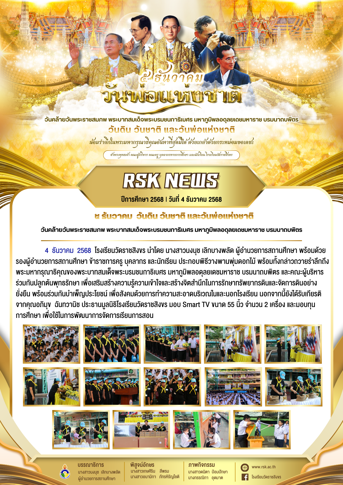4 ธันวาคม 2568 โรงเรียนวัดราชสิงขร นำโดย นางสาวนงนุช เลิกบางพลัด ผู้อำนวยการสถานศึกษา พร้อมด้วยรองผู้อำนวยการสถานศึกษา ข้าราชการครู บุคลากร และนักเรียน ประกอบพิธีวางพานพุ่มดอกไม้ พร้อมทั้งกล่าวถวายรำลึกถึงพระมหากรุณาธิคุณของพระบาทสมเด็จพระบรมชนกาธิเบศร มหาภูมิพลอดุลยเดชมหาราช บรมนาถบพิตร และคณะผู้บริหารร่วมกันปลูกต้นพุทธรักษา เพื่อเสริมสร้างความรู้ความเข้าใจและสร้างจิตสำนึกในการรักษาทรัพยากรดินและจัดการดินอย่างยั่งยืน พร้อมร่วมกันบำเพ็ญประโยชน์ เพื่อสังคมด้วยการทำความสะอาดบริเวณในและนอกโรงเรียน นอกจากนี้ยังได้รับเกียรติจากคุณอภิมุข ฉันทวานิช ประธานมูลนิธิโรงเรียนวัดราชสิงขร มอบ Smart TV ขนาด 55 นิ้ว จำนวน 2 เครื่อง และมอบทุนการศึกษา เพื่อใช้ในการพัฒนาการจัดการเรียนการสอน